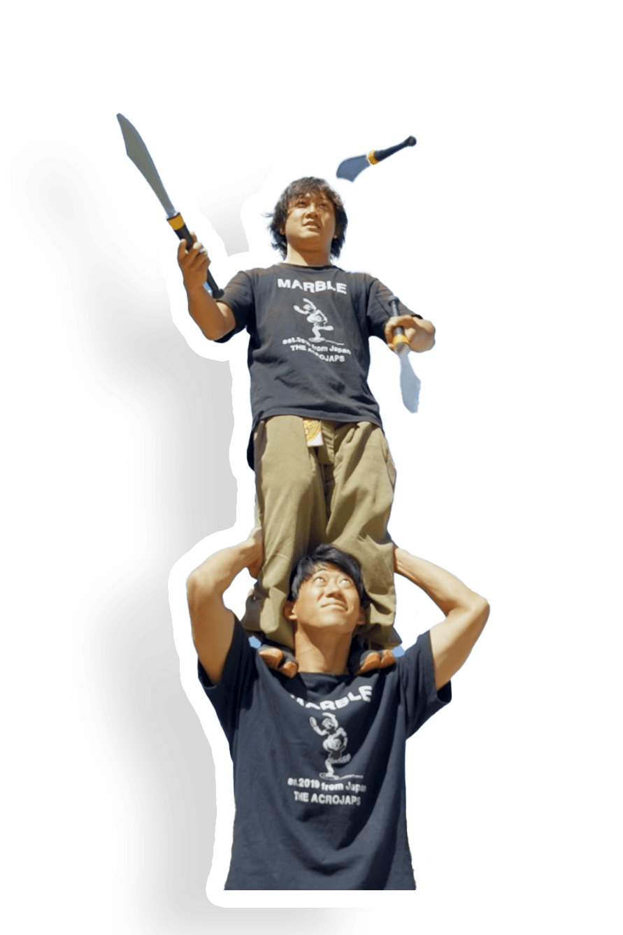 Marble is a Japanese street performance duo blending acrobatics, humor and precision into an unforgettably friendly and contagious act. With a unique style honed across 6 countries, countless international festivals and many meals of Sushi, they bring energy that captivates every crowd.